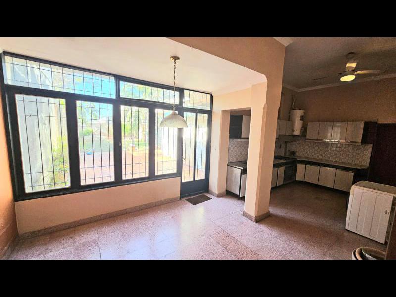 *Cocina comedor (Con mesada, bacha doble de acero inoxidable, grifería, mueble de alacena y bajo mesada de madera, termotanque, cocina industrial de 6 hornallas y horno);