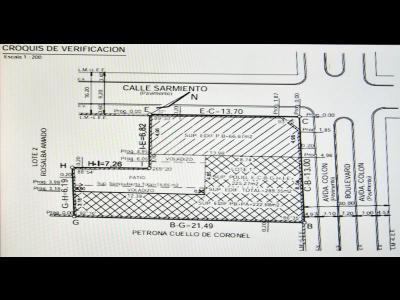 Superficie terreno: Terreno esquina (Irregular) compuesto por 10 metros de frente sobre Av. Colon, 13,60 metros de frente sobre calle Sarmiento y 21,49 metros de fondo. Superficie total del terreno 225,27 metros cuadrados. Ver imagen plano mensura en galería de fotos.
