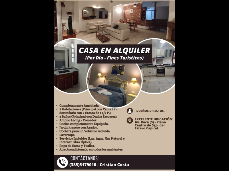 Se alquila hermosa casa con cochera en pleno centro de cuidad capital completamente equipada (Temporario - Fines Turisticos). Excelente ubicación, zona de bares y restaurantes, cerca de los principales lugares turísticos. Se puede programar visita previa para ver la propiedad, o bien, realizar un recorrido de la misma mediante video llamada. (Para su seguridad y comprobar que no es estafa! Cuidémonos entre todos!!!) Por consultas comunicarse al 3855179010.