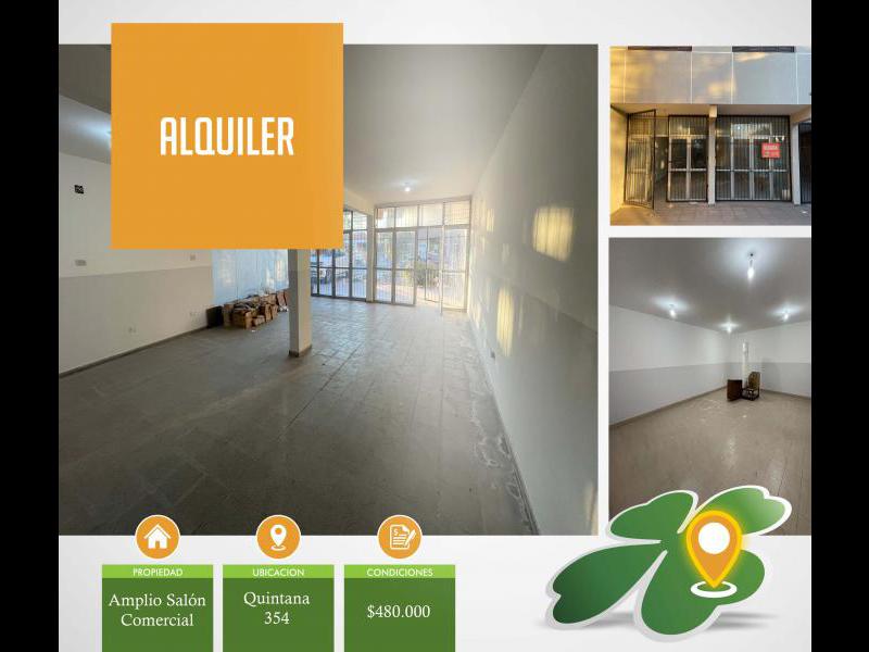 ALQUILA Salón Comercial sobre calle Quintana casi Irigoyen, amplio, con salón principal adelante, amplio lateral y salón grande en el fondo. Frente vidriado, enrejado con baño y mesada. Zona con excelente nivel de transito.