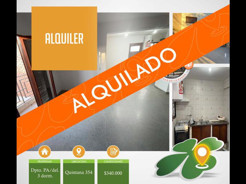 ALQUILA Departamento primer piso, de 3 dormitorios, cocina comedor living en L amplio, Baño completo, Balcón, lavadero en pequeño patio, Garaje, ubicado en Quintana casi Irigoyen LB. La amplitud que estabas necesitando!